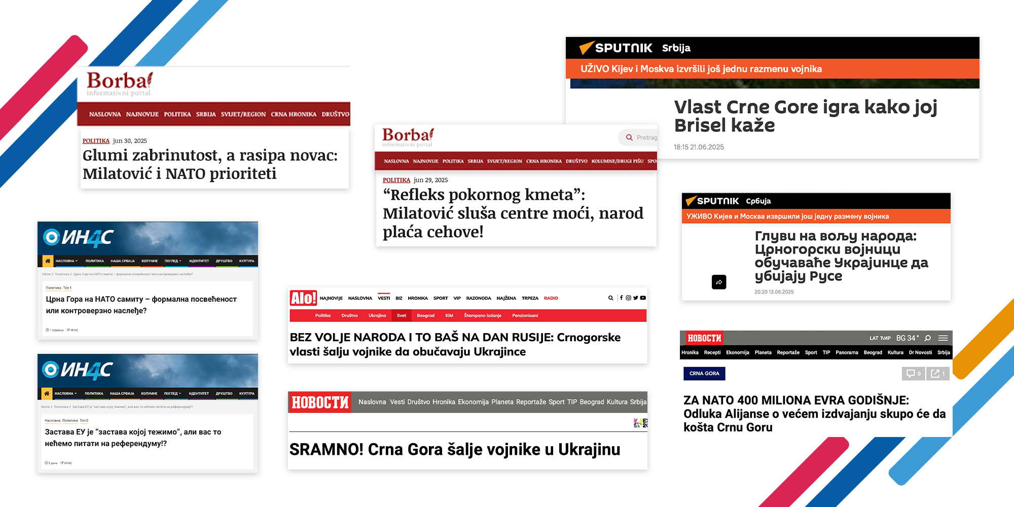 Beyond Montenegro’s own pro-Serbian and pro-Russian online outlets, media portals in Serbia and branches of Russian media in the Balkans play a significant role in promoting anti-Western and pro-Russian narratives. An analysis of two articles published by Sputnik Serbia and Večernje Novosti reveals strong criticism of Montenegro’s foreign policy and security alignment. Dominant narratives in these pieces revolve around themes of estrangement from Serbia, servility toward the West, illegitimate decision-making, and the financial and security unsustainability of NATO integration. Furthermore, these outlets feature narratives that glorify Russia. Conversely, Montenegro’s decision to send its soldiers to the European Union Military Assistance Mission in support of Ukraine is presented as an act of betrayal against Russia. This decision provoked strong reactions from pro-Russian circles who, by manipulating information and using specific narratives, attempted to influence public emotion and perception. For instance, Sputnik Serbia, a branch of the Kremlin’s propaganda channel, pushed the narrative that Montenegrin soldiers would be training Ukrainians to kill Russians, subtly implying direct military aggression against Russia and aiming to provoke public fear. They also perpetuated the common claim that Montenegro is acting under Western pressure, implying a loss of its sovereignty. Tabloids controlled by the Serbian regime reported in a similar vein, emphasizing that Montenegro made a shameful decision without the will of the people, specifically on Russia Day. The goal of such reporting is to activate pro-Russian sentiments in Montenegro and explain government decisions through narratives of external pressure.
