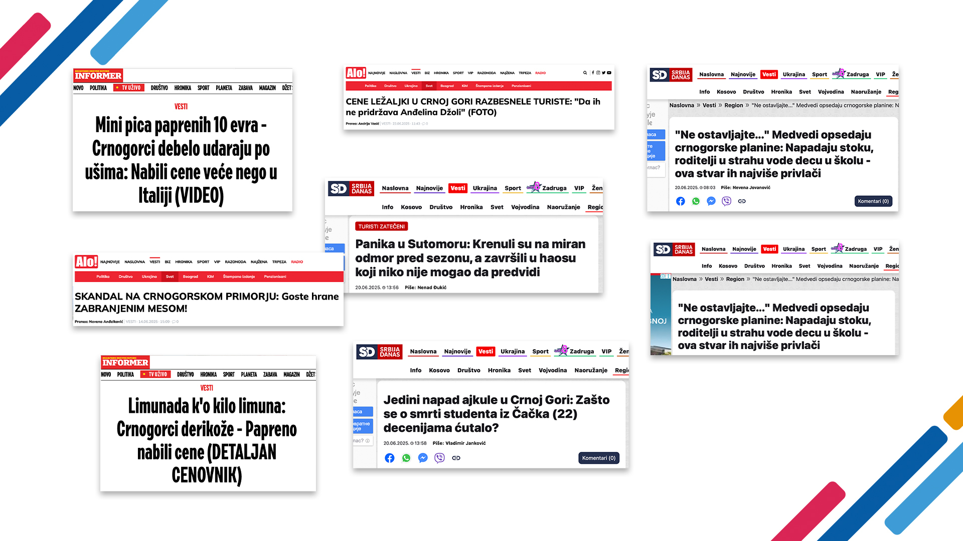 Tekstovi sa naslovima poput Limunada k’o kilo limuna: Crnogorci derikože, Mini pica paprenih 10 evra – Crnogorci debelo udaraju po ušima i U Crnoj Gori sve bezobrazno poskupelo: Cena čizkejka “bode oči” turistima jasno ukazuju na uređivačku intenciju srpskih portala s ciljem diskreditacije Crne Gore uz upotrebu grubih, kolokvijalnih pa i uvrjedljivih izraza. Tekstovi sadrže niz senzacionalističkih tvrdnji koje ne nude stvarni kontekst. Selektivno predstavljanje cijena služi isključivo da izazove ljutnju i bijes kod čitalaca i odvrati ih od ljetovanja na Crnogorskom primorju. Učestalo je i poređenje Crne Gore sa drugim destinacijama poput Italije, Azurne obale i Egipta koje se prikazuju kao bolje organizovane i jeftinije. Svrha takvih tekstova nije objektivno vrednovanje turističkih ponuda, već oblikovanje percepcije da je Crna Gora postala skuplja i lošija čak i od tradicionalno prestižnih ili egzotičnih lokacija.